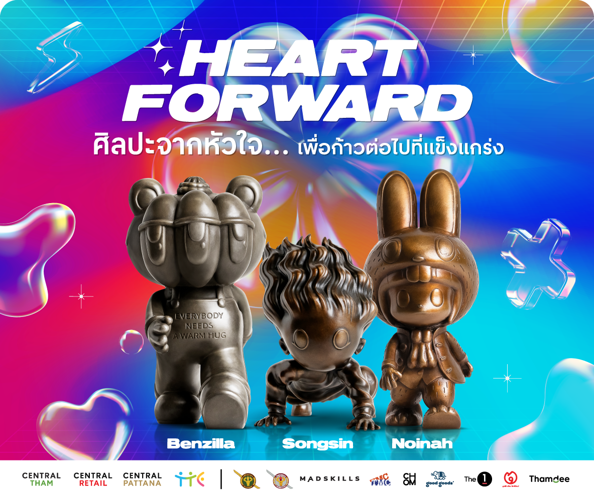 “HEART FORWARD” จุดเริ่มต้นจากความเชื่อของไทย ที่เริ่มต้นก้าวเท้าด้านซ้ายจะเจอแต่ความโชคดี สื่อถึงทุกการก้าวเดินจะมีแต่ความมั่นคง โชคดี เริ่มต้นชีวิตที่ดีไปในเส้นทางแห่งความสุขผ่านคาแรคเตอร์ Art Sculpture ของทั้ง 3 ศิลปินที่พร้อมใจกันก้าวเท้าซ้ายมุ่งไปข้างหน้าเพื่อส่งต่อพลังก้าวแห่งการรักษาไปถึงผู้ป่วยอย่างทั่วถึงและรวดเร็ว