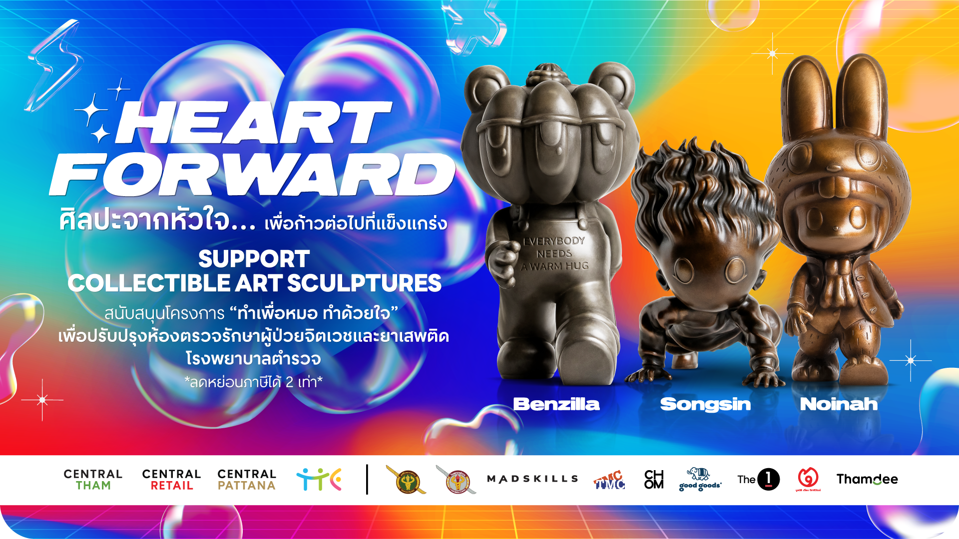โครงการ “ทำเพื่อหมอ ทำด้วยใจ” คอลเลกชั่น Art Sculpture ภายใต้ Concept : “HEART FORWARD” เกิดขึ้นจากความตั้งใจที่จะเปลี่ยนความหลงใหลในงานศิลปะ กลายเป็นแรงผลักดันส่งต่อพลัง “การเยียวยา” จาก 3 ศิลปินแนวหน้าของไทย ได้แก่ Benzilla, Songsin และ Noinah มาร่วมออกแบบ Art Sculpture ผลงานชิ้นพิเศษการกุศลครั้งแรก รายได้หลังหักค่าใช้จ่ายจะนำไปสมทบทุนในการปรับปรุงห้องตรวจรักษาผู้ป่วยจิตเวชและยาเสพติดโรงพยาบาลตำรวจ ขยายพื้นที่รองรับผู้ป่วยและเพิ่มศักยภาพเครื่องมือรวมทั้งอุปกรณ์ที่จำเป็นในการรักษาให้ทันท่วงที