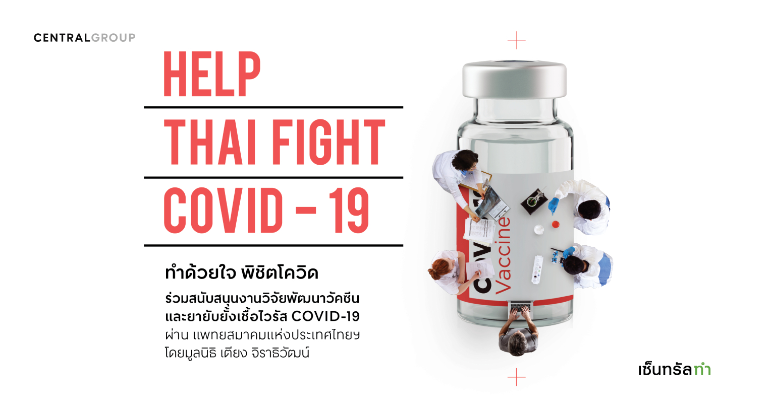 สถานการณ์การแพร่ระบาดของเชื้อไวรัสโคโรนา 2019 ทำให้จำนวนผู้ติดเชื้อเพิ่มมากขึ้นทุกวัน ส่งผลกระทบต่อทั่วโลก กลุ่มเซ็นทรัล ขอร่วมก้าวผ่านวิกฤตนี้ไปด้วยกัน จัดตั้งโครงการ “ทำด้วยใจ ไฟท์โควิด-19” (Help Thai Fight COVID-19) โดยมีเป้าหมายระดมทุน เพื่อมอบผ่านทางแพทยสมาคมแห่งประเทศไทยในพระบรมราชูปถัมภ์ ให้กับ คณะแพทยศาสตร์ มหาวิทยาลัยชั้นนำของไทยที่มีชื่อเสียงในด้านการวิจัยในระดับนานาชาติ เช่น คณะแพทยศาสตร์ศิริราชพยาบาล มหาวิทยาลัยมหิดล, คณะแพทยศาสตร์ โรงพยาบาลรามาธิบดี มหาวิทยาลัยมหิดล หรือ คณะแพทยศาสตร์จุฬาลงกรณ์ เป็นต้น โดยหวังว่า การทำวิจัยดังกล่าวจะได้ผลงานวิจัยที่จะนำมาใช้ควบคุมโรคโควิด-19 ให้ได้ผลอย่างรวดเร็วในวงกว้างยิ่งขึ้น