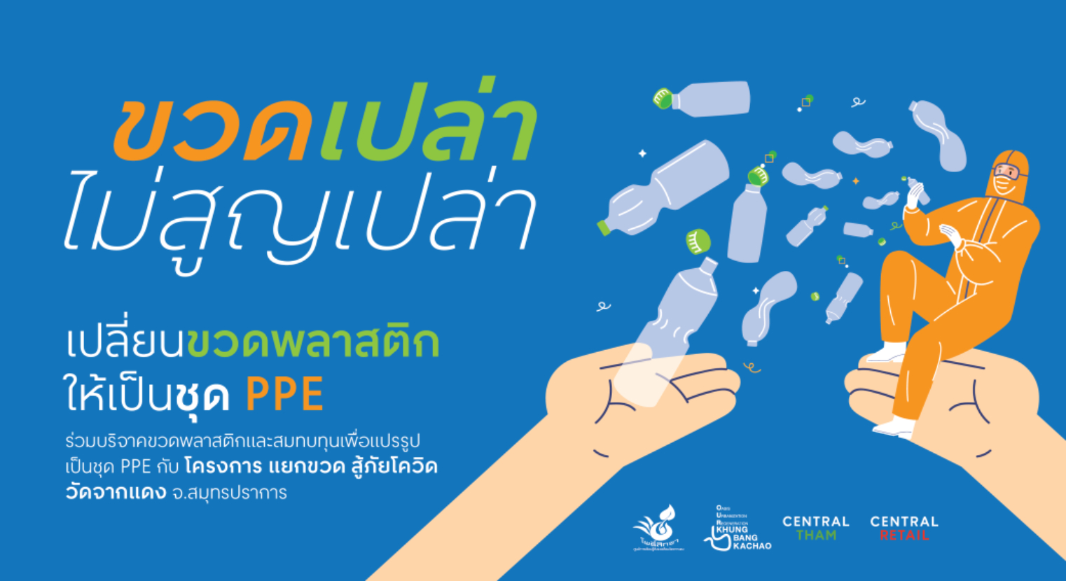 ในการประกอบศาสนกิจ และพนักงานเก็บขยะในพื้นที่ โดยผ่านความร่วมมือกับคณะทำงานการจัดการขยะ Our KhungBangKachao ซึ่งกลุ่มเซ็นทรัลเป็นหนึ่งในภาคีหลักและเป็นหัวหน้าคณะทำงานด้านการส่งเสริมอาชีพของโครงการนี้เราเล็งเห็นว่า นอกจากโครงการนี้จะช่วยเพิ่มความปลอดภัยให้กับผู้ที่เกี่ยวข้องแล้ว ยังส่งผลดีต่อสังคม ในด้านการส่เสริมอาชีพให้คนท้องถิ่นกว่า 100ครัวเรือน โดยการจ้างงานเพื่อตัดเย็บชุด และลดผลกระทบต่อ สิ่งแวดล้อม โดยการนำขวดพลาสติกที่ใช้แล้วมาแปรรูปเพื่อให้เกิดประโยชน์สูงสุด