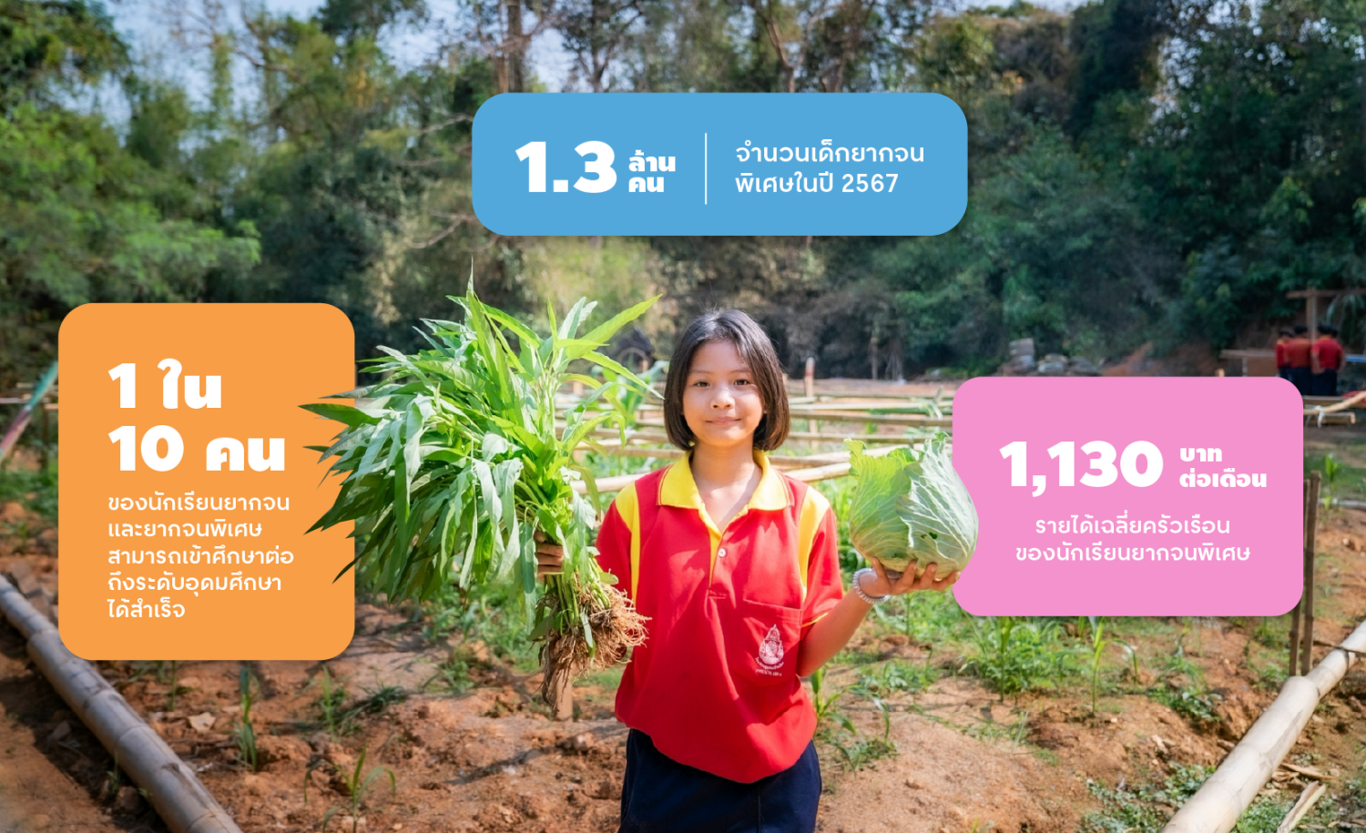 ในประเทศไทย ยังมีเด็กและเยาวชนจำนวนมากกว่า 1.3 ล้านคน* ที่อยู่ในครอบครัวยากจนพิเศษและเสี่ยงหลุดจากระบบการศึกษา โดยต้องเผชิญกับอุปสรรคทางเศรษฐกิจและปัญหาความเหลื่อมล้ำที่ทำให้โอกาสในการเรียนต่ออย่างต่อเนื่องกลายเป็นเรื่องยาก ครอบครัวของนักเรียนยากจนพิเศษมีรายได้เฉลี่ยเพียง 1,133 บาทต่อเดือน* และมีนักเรียนยากจนและยากจนพิเศษเพียง 1 ใน 10 คนเท่านั้น* ที่สามารถเข้าศึกษาต่อถึงระดับอุดมศึกษาต่อได้สำเร็จ ซึ่งสะท้อนให้เห็นถึงสถานการณ์ที่ยังท้าทายและต้องการความร่วมมือจากทุกภาคส่วนในการแก้ไขปัญหาอย่างต่อเนื่อง